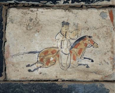 它的“不一般”,首先在于其“極簡(jiǎn)卻傳神”的藝術(shù)風(fēng)格。該磚的畫面以赭石色為底,墨線寥寥,卻生動(dòng)勾勒出一位策馬疾馳的驛使:頭戴魏晉幘帽,身著右衽短衫,左手控韁,右手舉著文書。而駿馬則四蹄騰空,動(dòng)態(tài)感十足,一種風(fēng)馳電掣的緊迫感似從畫中撲面而來。更耐人尋味的是,畫師刻意省略了驛使的嘴巴:這一“殘缺”設(shè)計(jì),并非疏忽,而是古人智慧的體現(xiàn),象征著郵驛制度中“守口如瓶”的保密原則,使其成為中國古代信息保密文化的生動(dòng)見證。