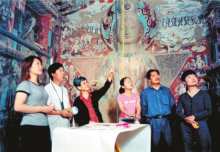 樊錦詩帶領(lǐng)項目團隊在莫高窟第275窟核對石窟考古報告測繪圖。